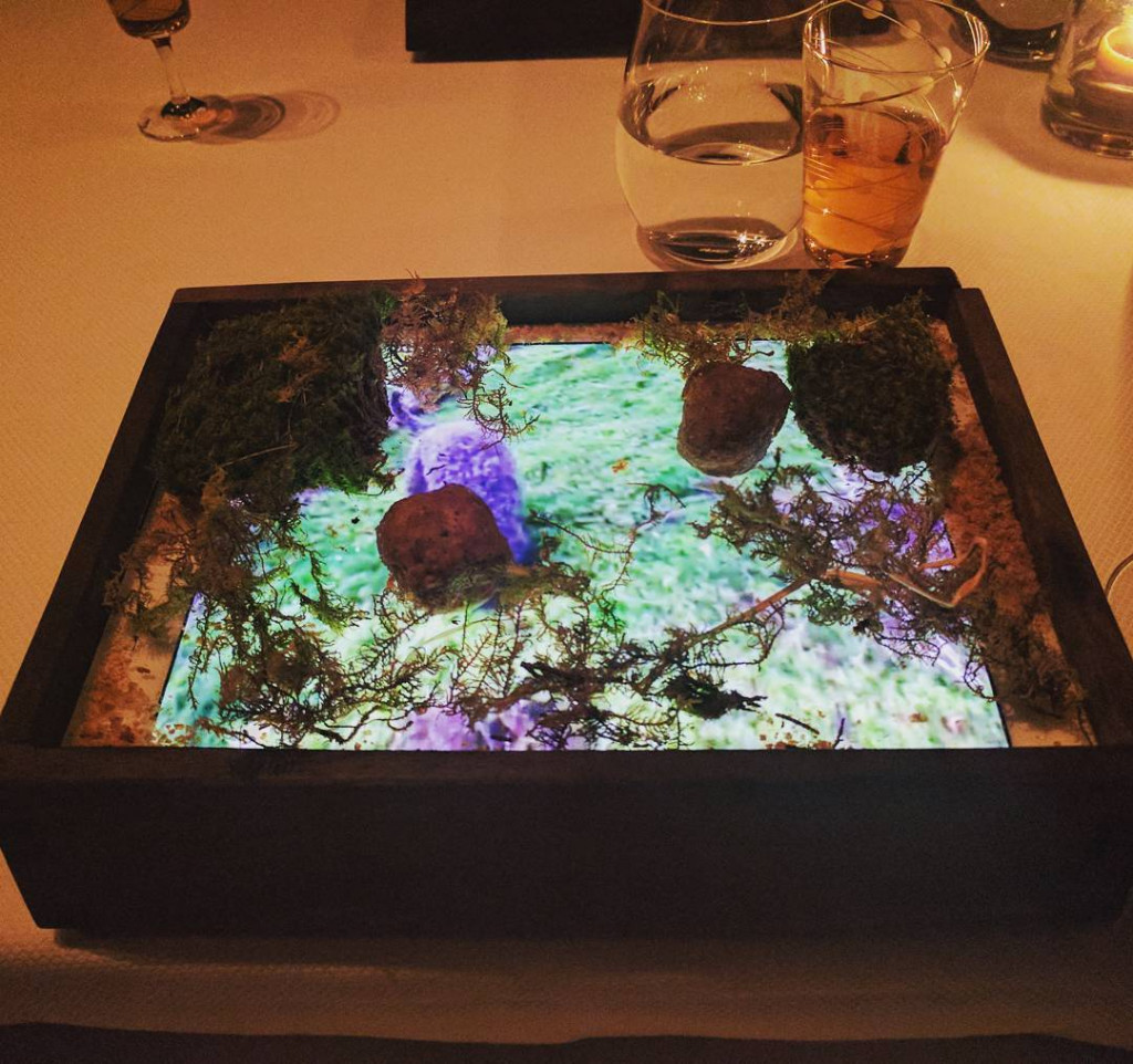 Блюдо “Собака в поисках золота” представляет собой ассорти из поджаренных трюфелей, белых грибов, сельдерея и каштанового пюре. Всё это выложено на прозрачную пленку, под которой находится iPad, воспроизводящий видеоролик о поиске трюфелей со специально обученной собакой.