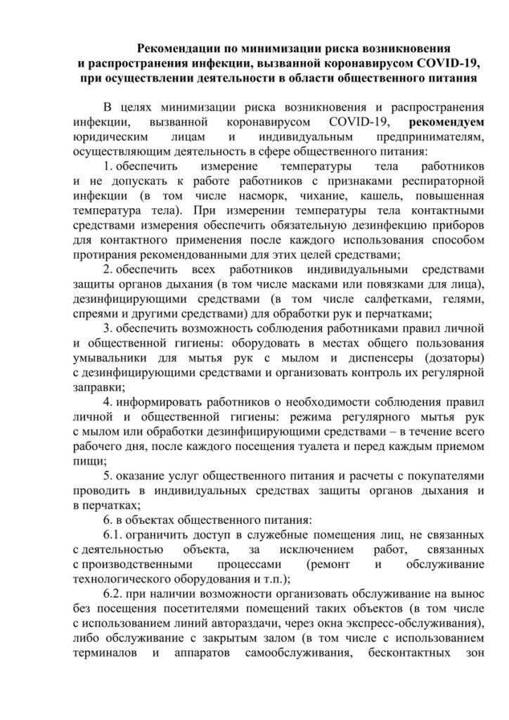 В целях минимизации риска возникновения и распространения инфекции, вызванной коронавирусом COVID-19, рекомендуем юридическим лицам и индивидуальным предпринимателям, осуществляющим деятельность в сфере общественного питания: